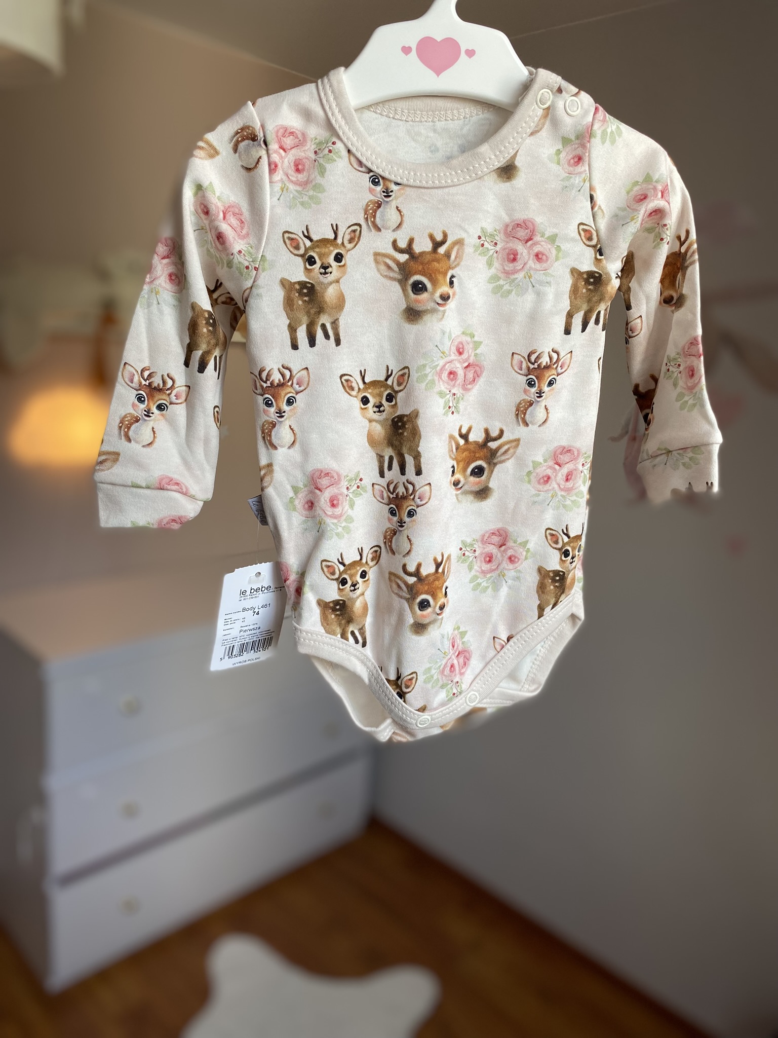 Jeśli szukasz ubranka, które połączy w sobie bajkowy wzór z praktycznym krojem, body niemowlęce – Jelonki w kwiatach będzie doskonałym wyborem. Na jasnym tle pojawia się uroczy motyw małych jelonków w otoczeniu subtelnych, różowych kwiatuszków. To dziewczęcy wzór, który zachwyca lekkością i delikatnością, a jednocześnie jest na tyle uniwersalny, że pasuje do wielu stylizacji.