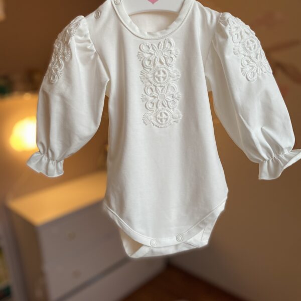 Body dostępne w rozmiarach 56–68 idealnie sprawdzi się jako pierwsze ubranko w szpitalu, a później będzie niezastąpionym elementem codziennej garderoby w pierwszych tygodniach i miesiącach życia dziecka. Subtelne połączenie beżu i zieleni sprawia, że wzór traktorków jest nie tylko uroczy, ale także praktyczny – na tkaninie mniej widoczne będą drobne zabrudzenia.
