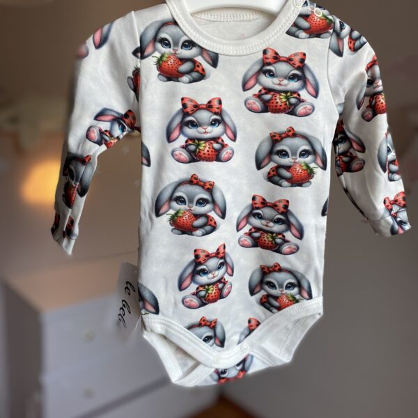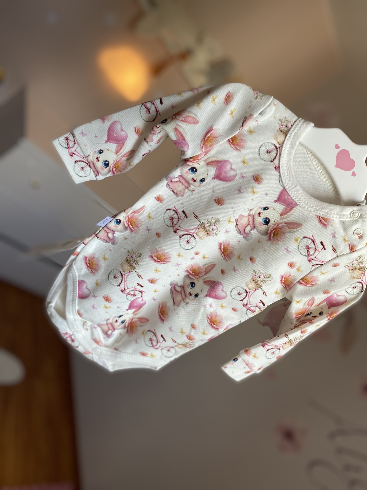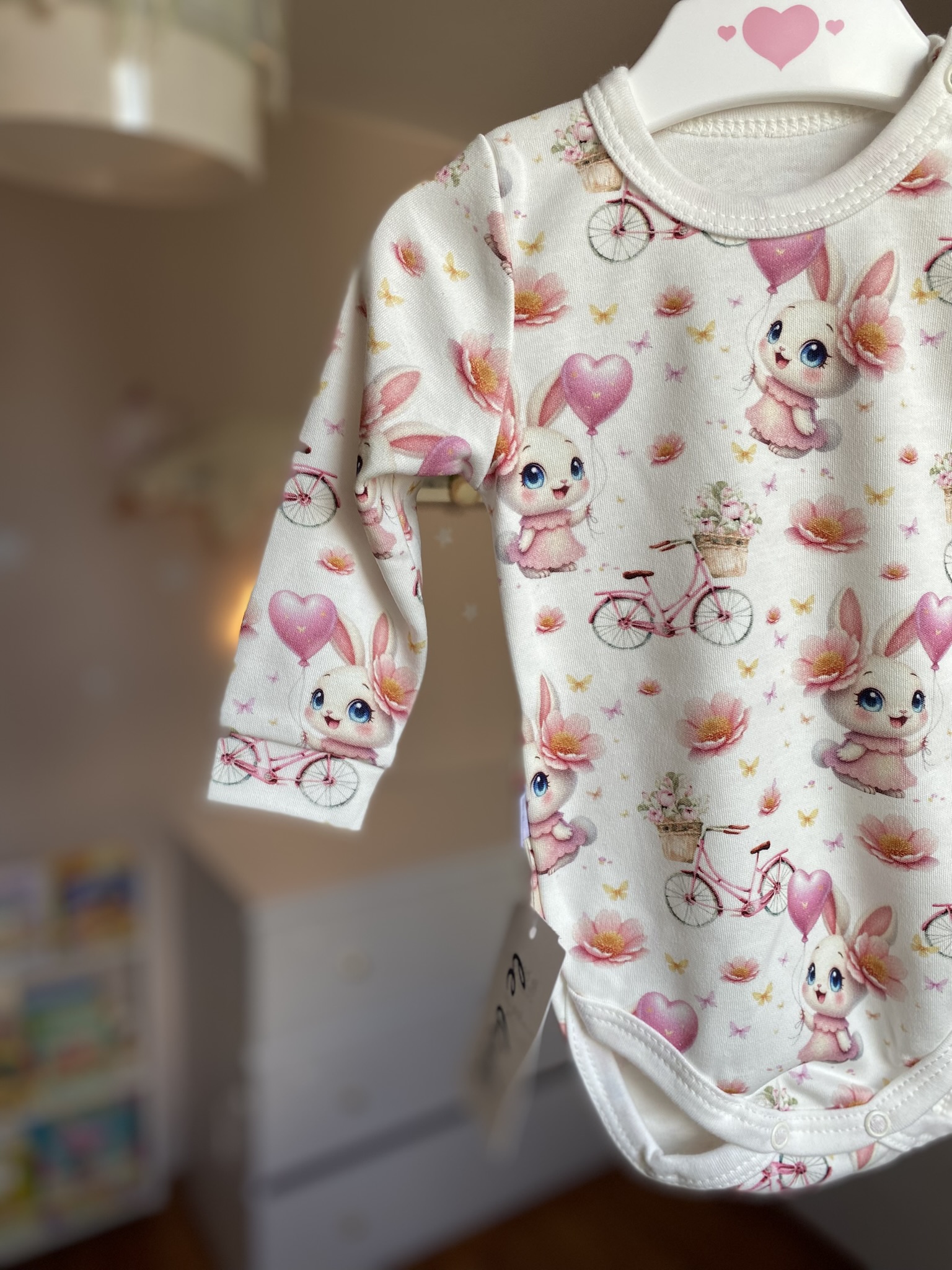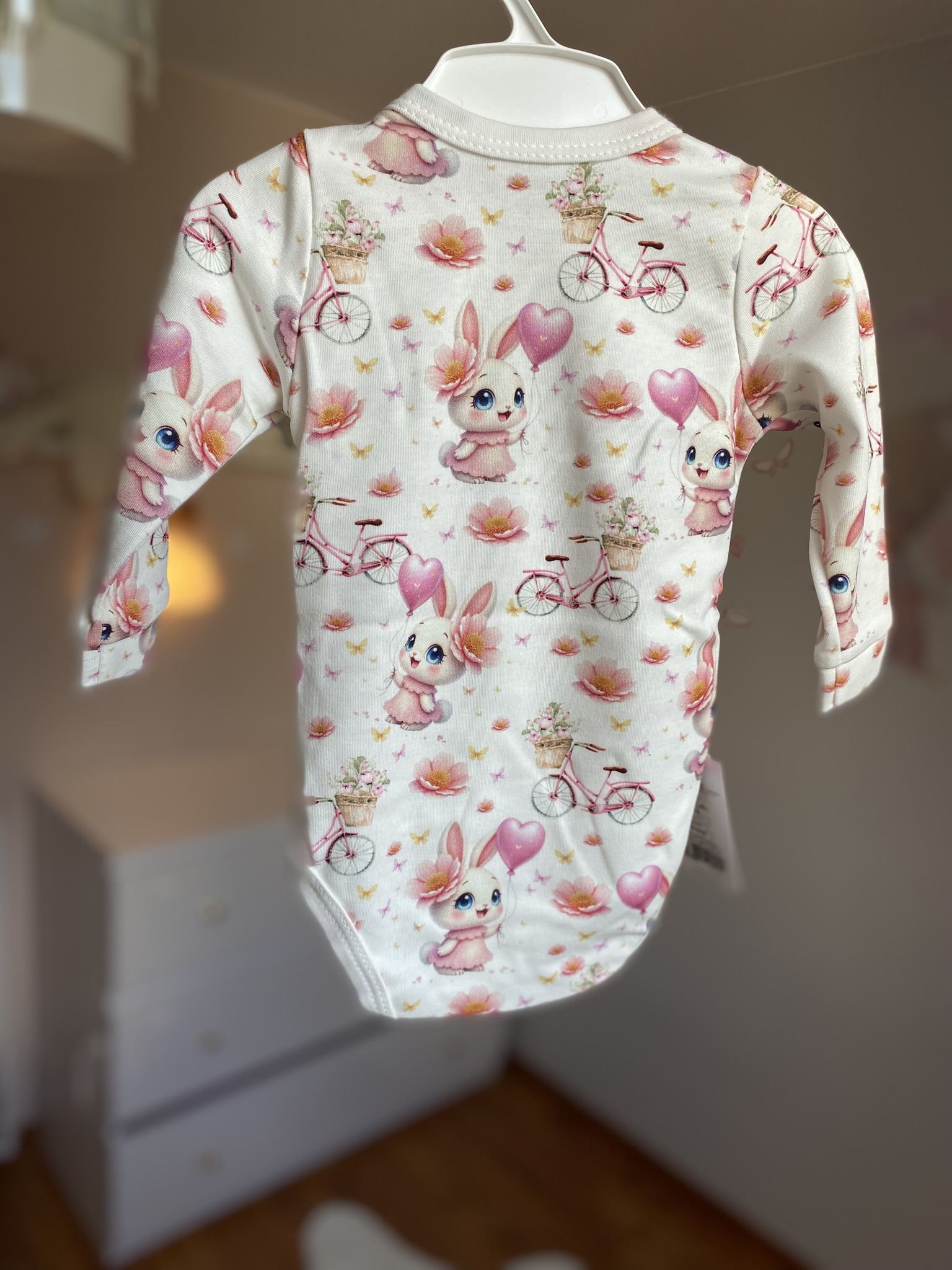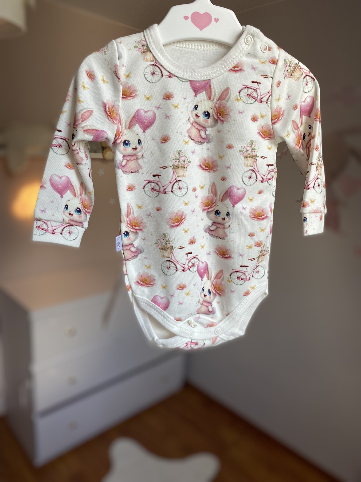Każdy maluch ma swoje małe marzenia, a ten wzór idealnie je oddaje. Body niemowlęce – Króliczek Marzyciel to ubranko, które łączy subtelność z dziecięcą fantazją. Na białym tle pojawia się króliczek w różowej sukience, z balonikiem i małym rowerkiem. Całość wygląda jak ilustracja z bajki – lekka, urocza i niezwykle dziewczęca.