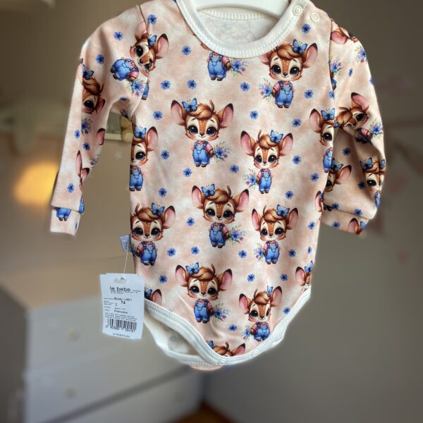 Rodzice docenią praktyczne rozwiązania – zapięcia przy szyi i w kroku, które ułatwiają przebieranie oraz zmianę pieluszki. Długi rękaw chroni delikatne rączki w chłodniejsze dni, a jednocześnie nie krępuje ruchów podczas zabawy czy pierwszych prób raczkowania.