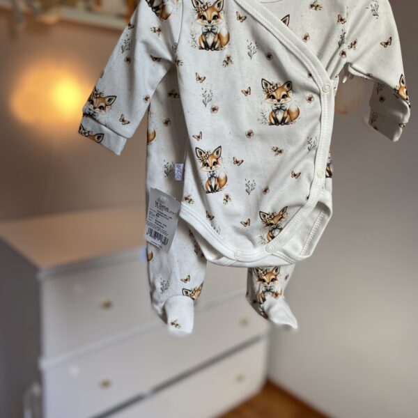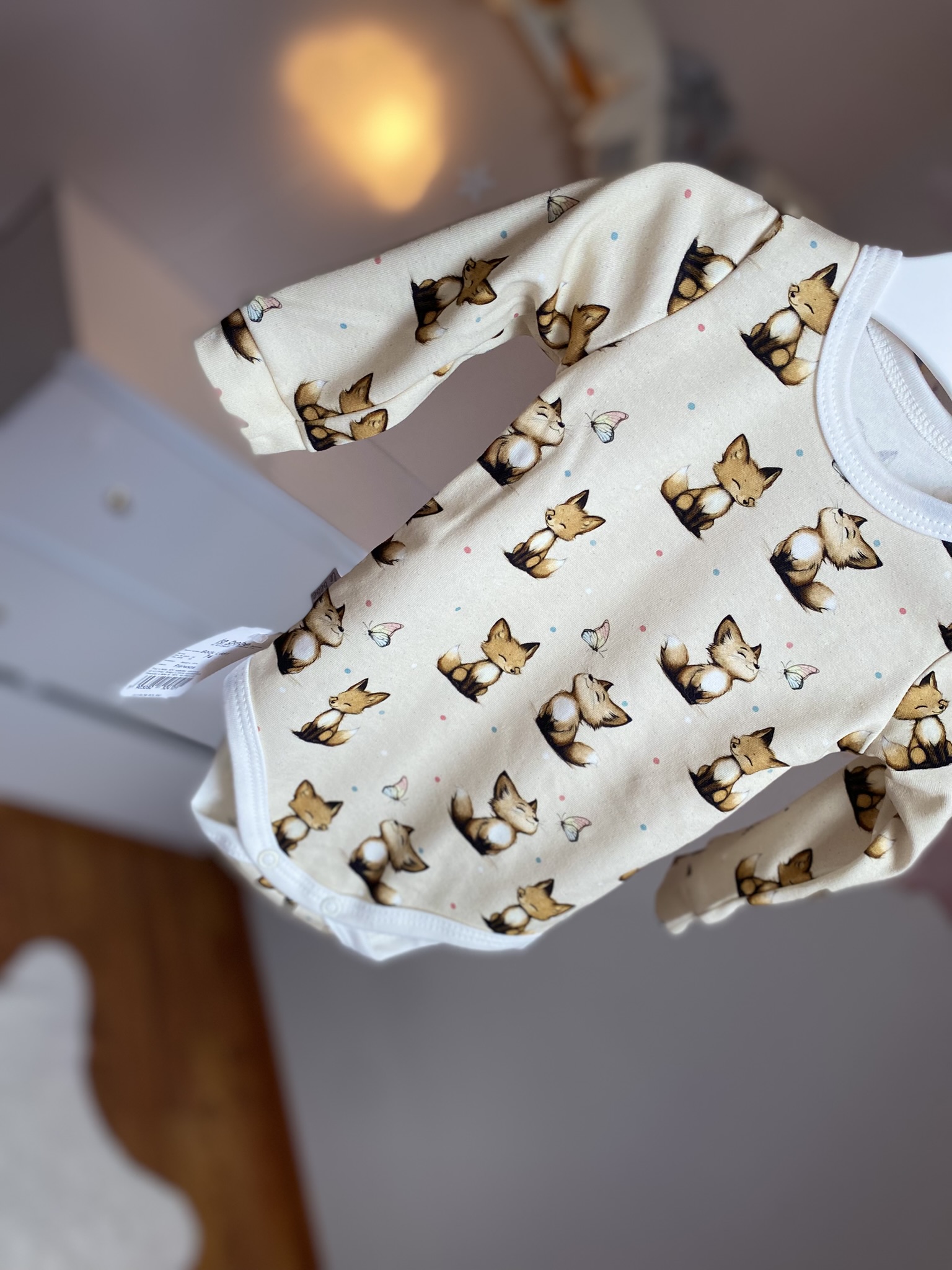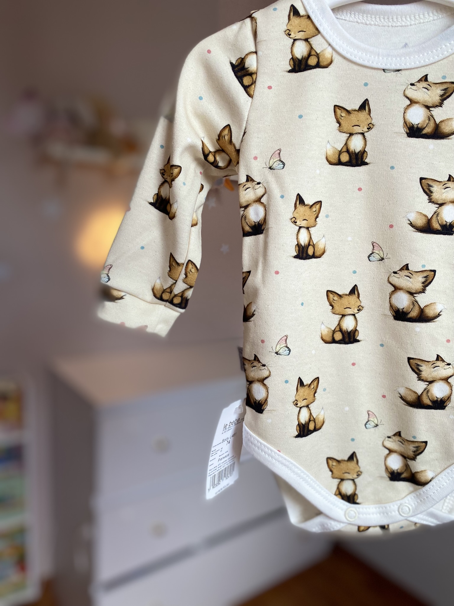 Body posiada beżowe tło, które pięknie współgra z nadrukiem uroczych lisków i subtelnych motylków, tworząc spokojny, harmonijny i przyjazny dla oka wzór. Kolory są stonowane i naturalne – idealne dla rodziców, którzy cenią minimalizm, elegancję i styl w dziecięcych ubrankach.