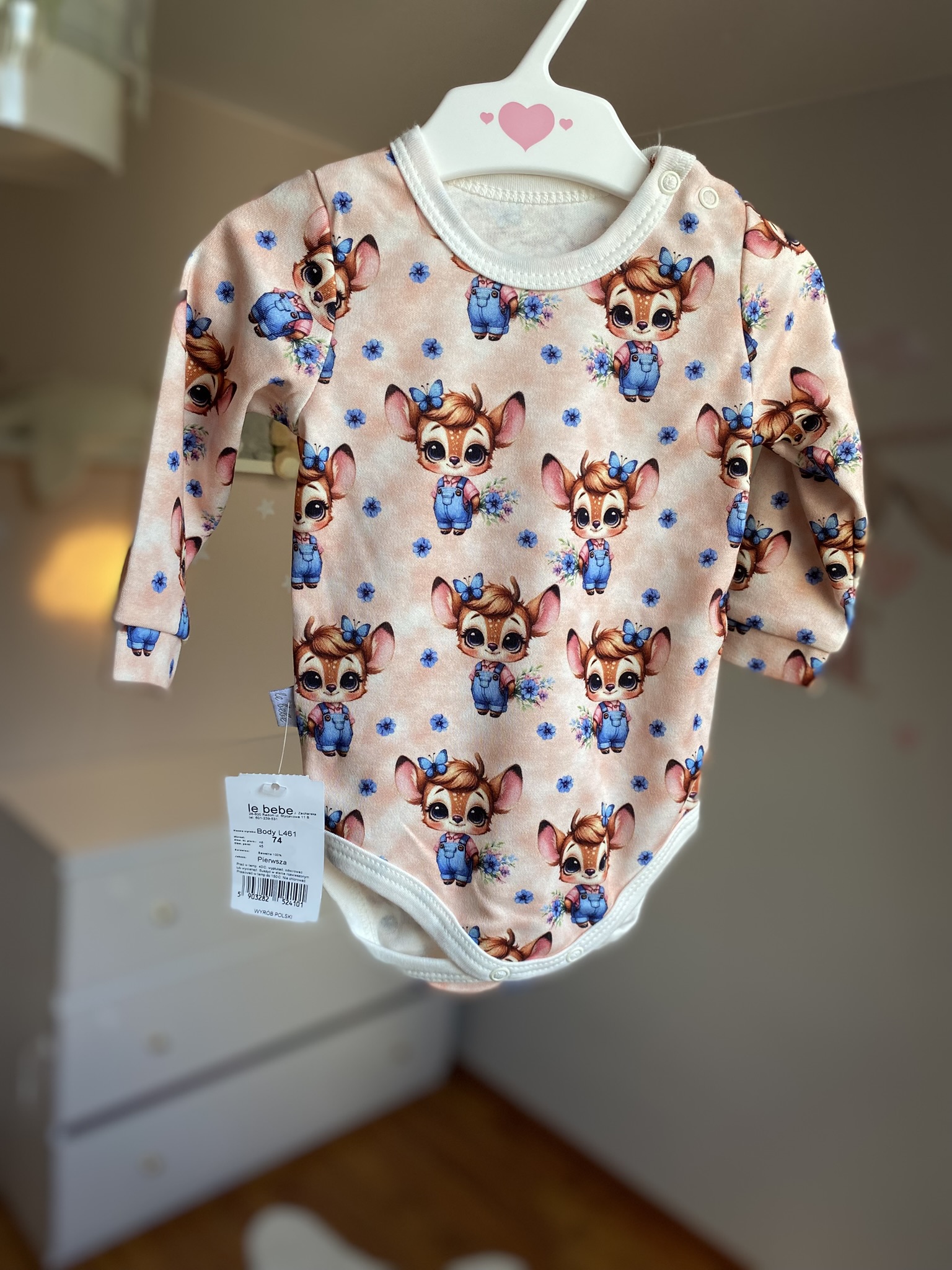 Body niemowlęce – Sarenki w chabrach to propozycja, która wprowadza do garderoby maluszka odrobinę natury i bajkowego uroku. Na morelowym tle tańczą delikatne sarenki, otoczone błękitnymi kwiatami i drobnymi motylkami. To wzór, który zachwyca subtelnością i dziewczęcym wdziękiem. Przy tym jest praktyczny – dzięki stonowanym barwom nie widać na nim drobnych zabrudzeń, co czyni go idealnym wyborem na co dzień.