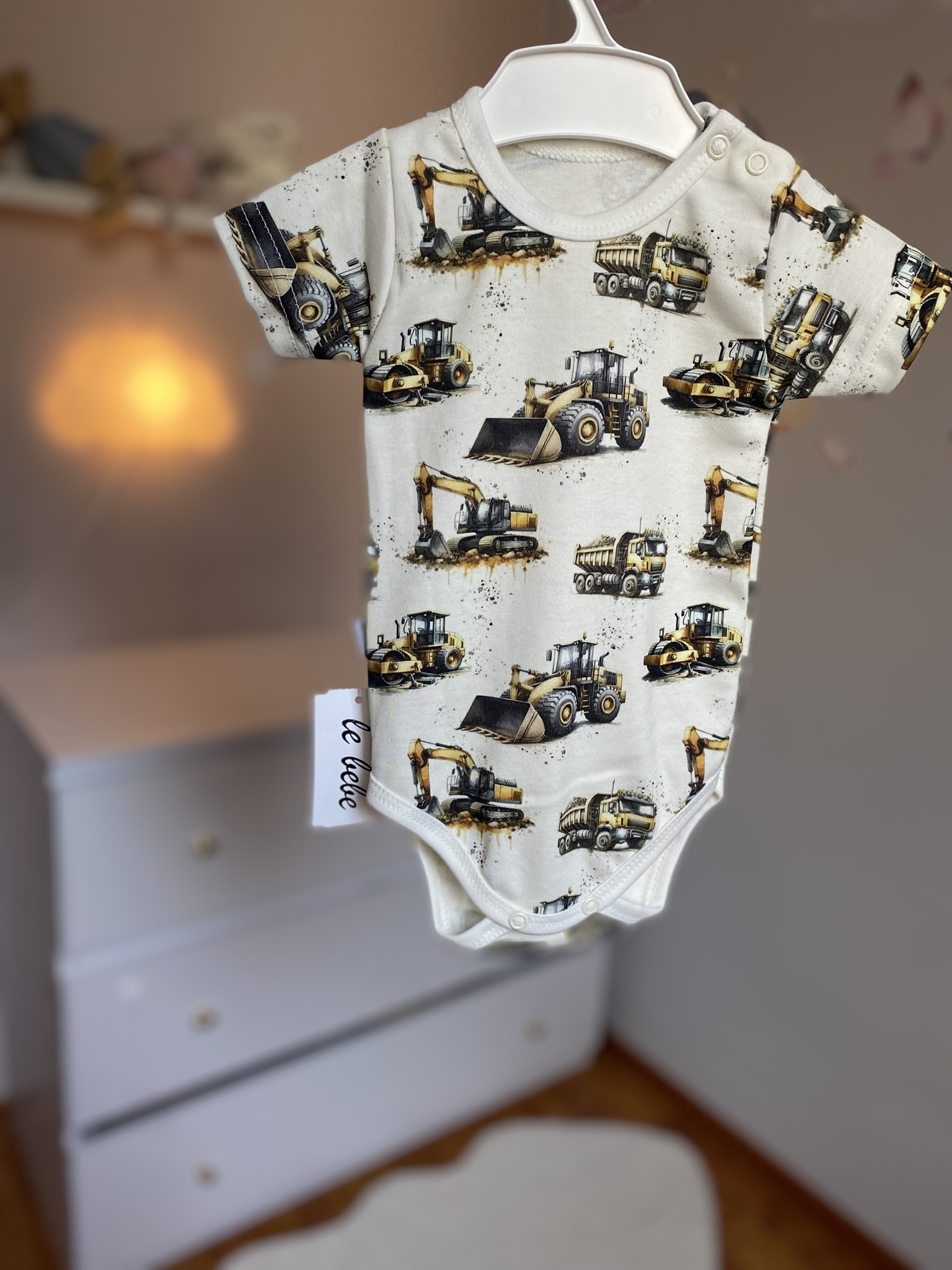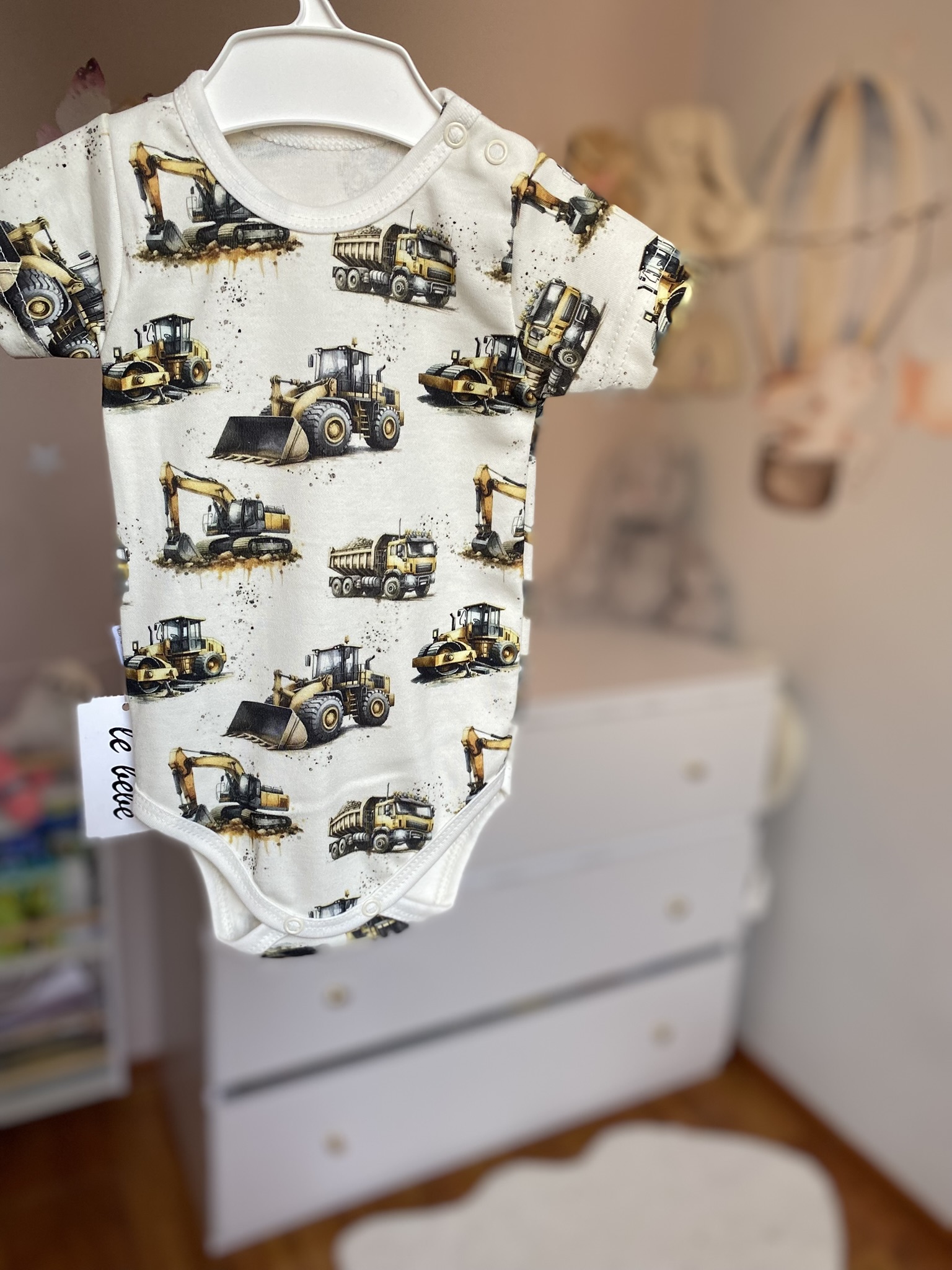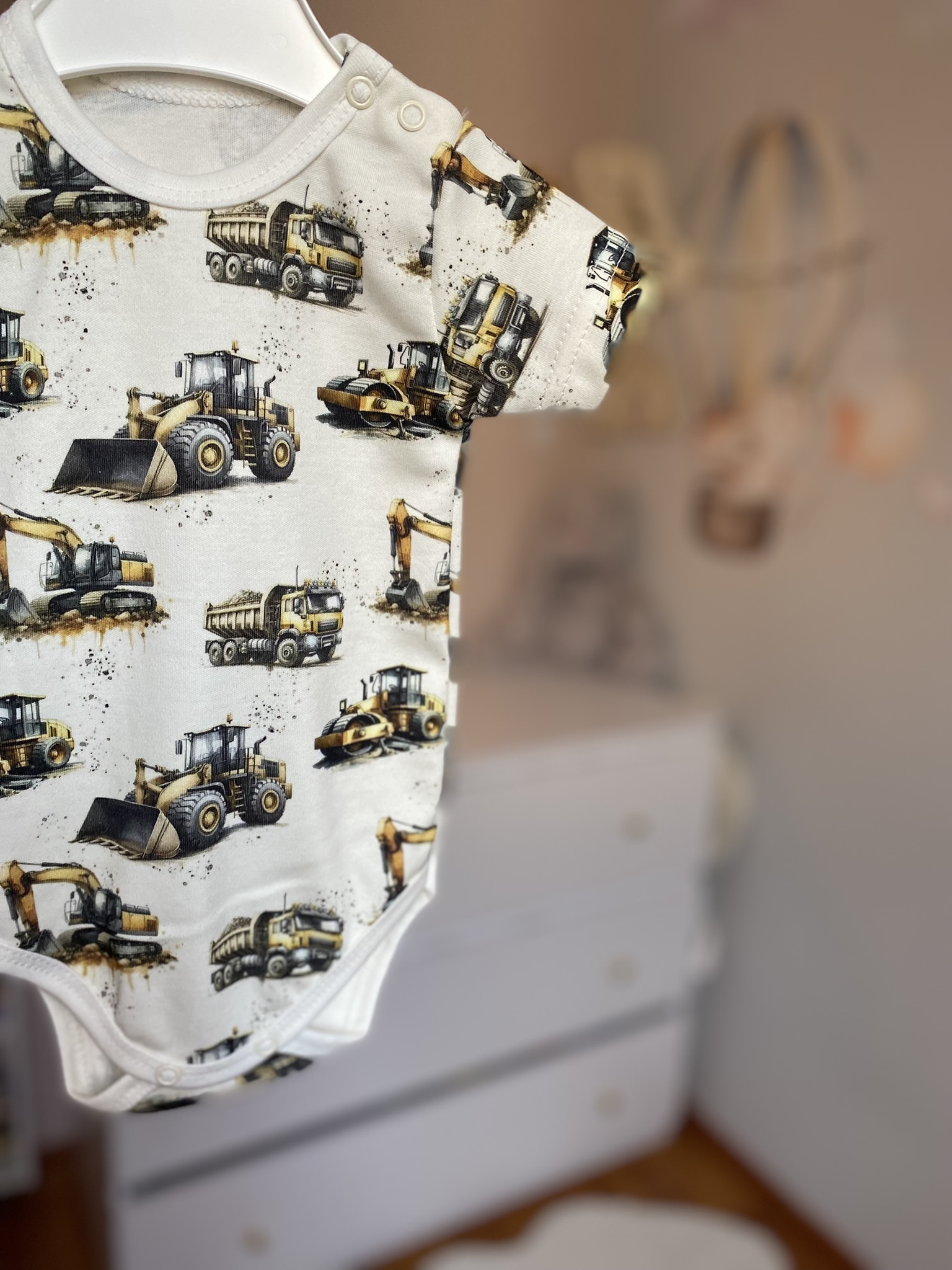 Urocze i wygodne Body niemowlęce – Żółte kopareczki | Krótki rękaw to idealna propozycja dla małych odkrywców. Klasyczne białe tło w połączeniu z motywem kopareczek i innych maszyn budowlanych tworzy ponadczasowy, chłopięcy wzór, który świetnie sprawdzi się na co dzień.
