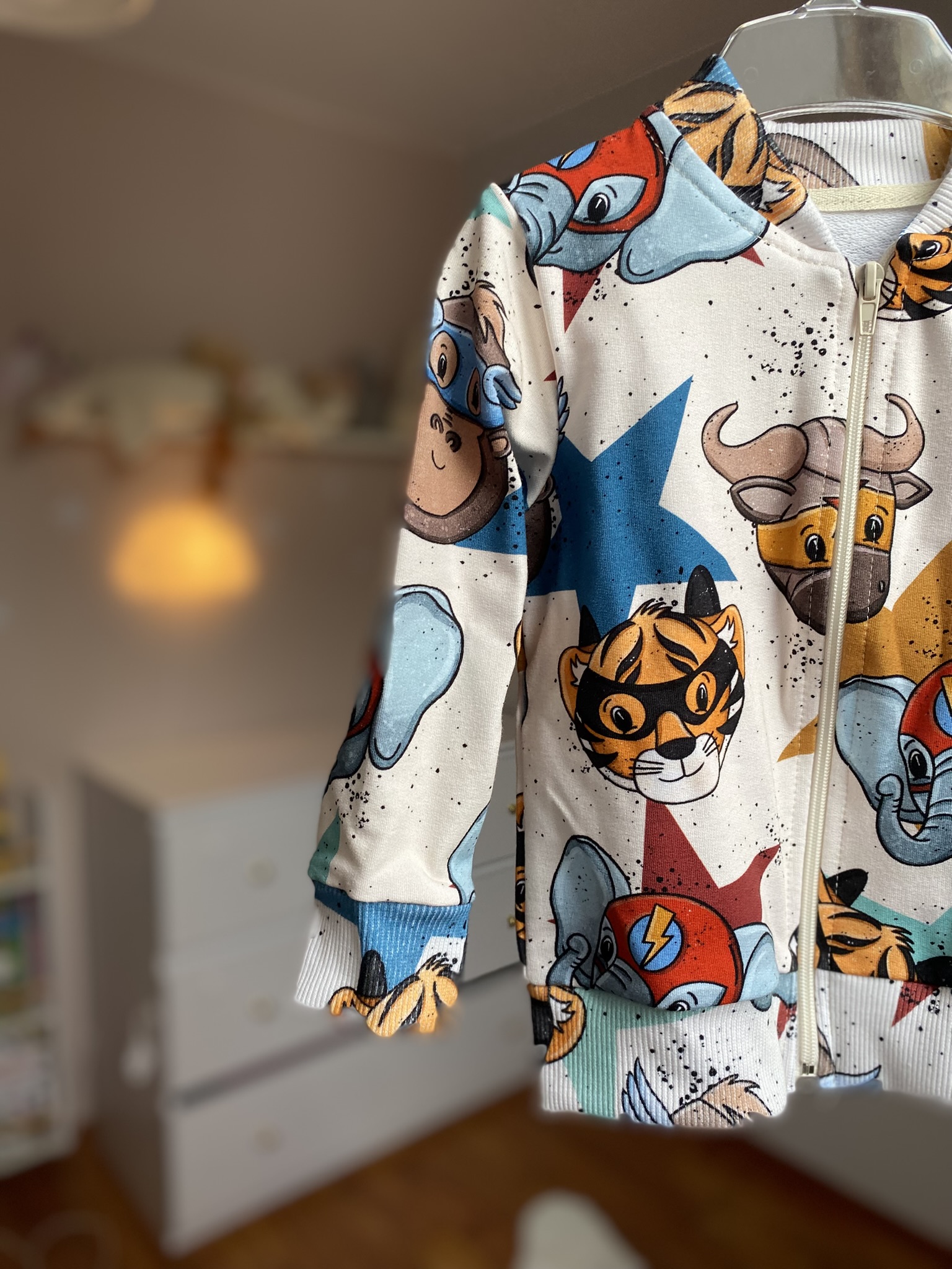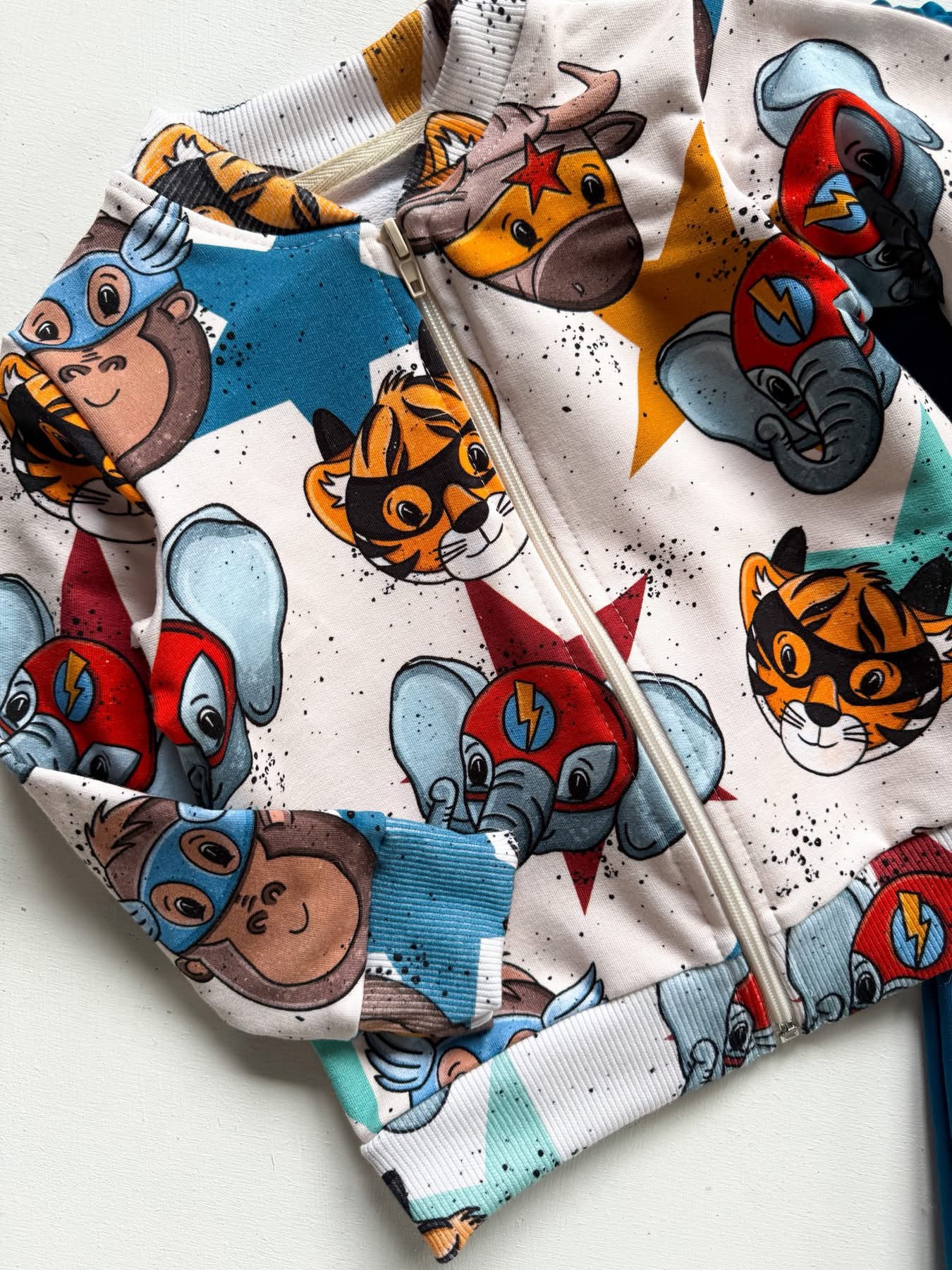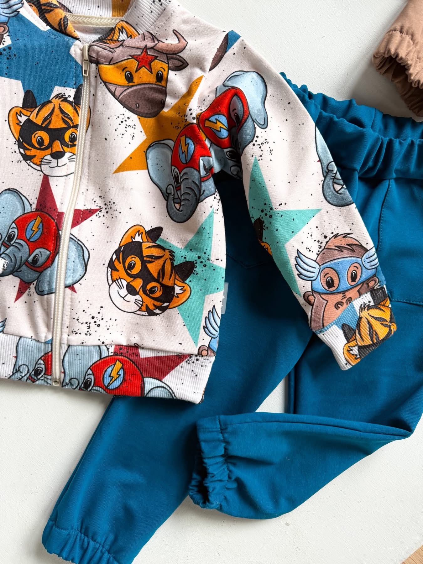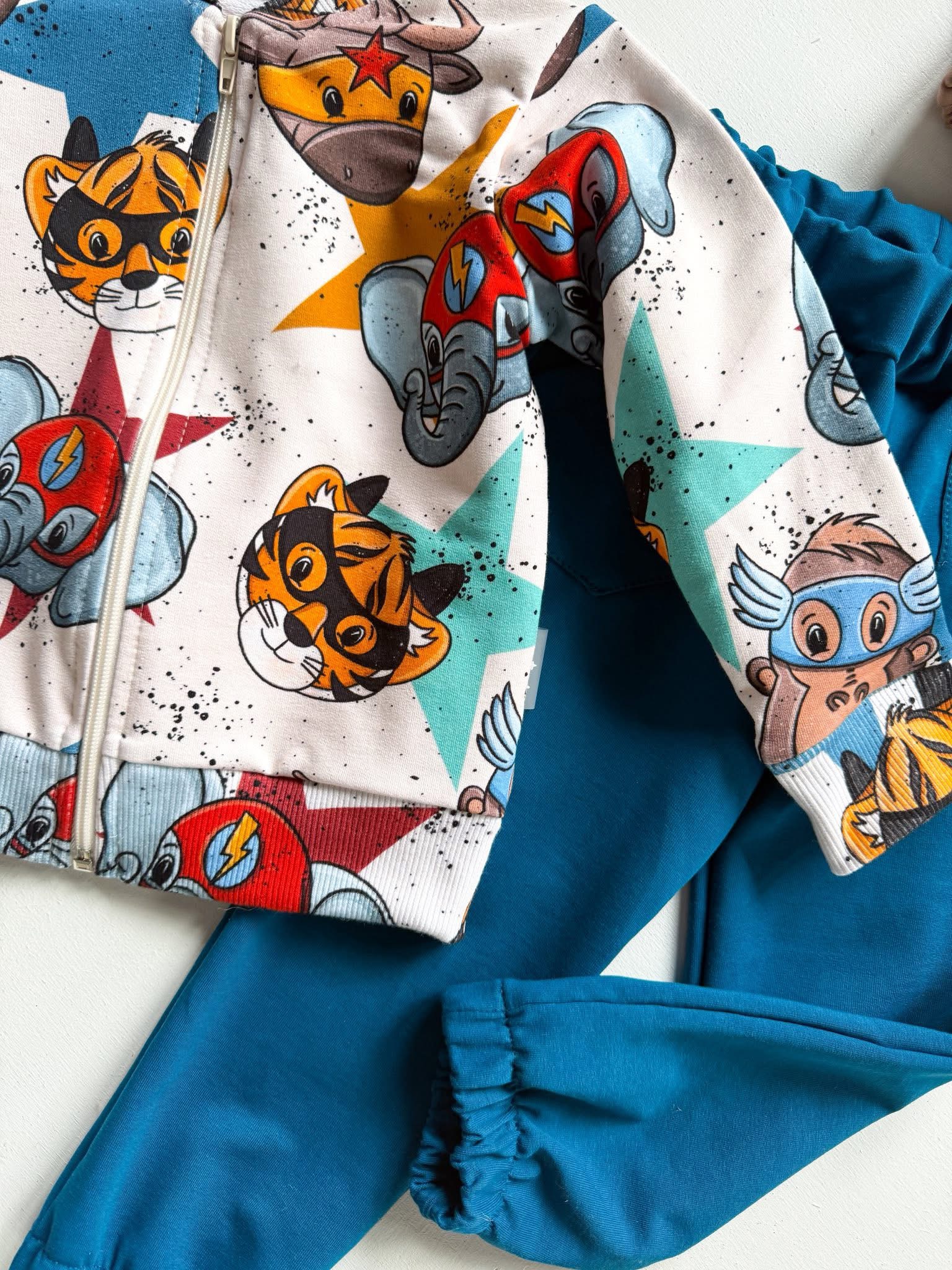 👕 Bluza typu bomberka to prawdziwy hit w tym zestawie. Ma zamek z przodu, wygodny krój i elastyczne ściągacze przy rękawach oraz w pasie. Wyróżnia ją fantastyczny wzór — kolorowi superbohaterowie w wersji zwierzątek, takich jak słonik, małpka i tygrysek, tworzą niepowtarzalny, energiczny motyw. Tło i kolorystyka są dopracowane w każdym szczególe – całość wygląda stylowo i dziecięco jednocześnie.