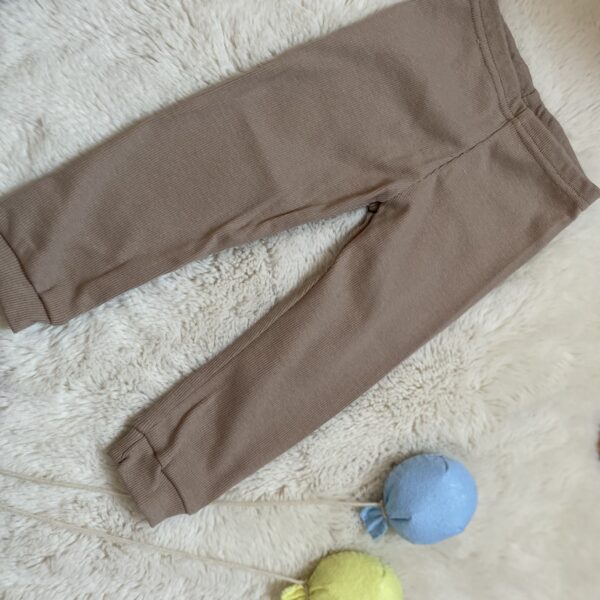 👖 Spodnie niemowlęce – w jednolitym, ciepłym odcieniu brązu, idealnie komponującym się z górą kompletu. Elastyczna gumeczka w pasie sprawia, że spodnie dobrze się trzymają, nie uciskają brzuszka i są bardzo wygodne w noszeniu. Dzięki klasycznemu krojowi i stonowanemu kolorowi, spodnie świetnie sprawdzą się również w innych stylizacjach, co czyni je niezwykle praktycznym elementem garderoby.