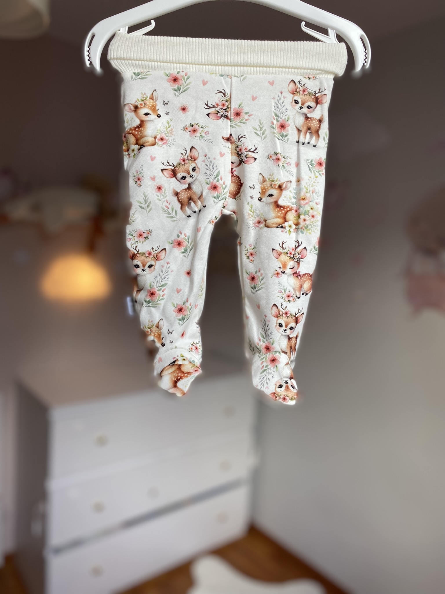 Największą ozdobą tego zestawu jest przepiękny, subtelny wzór sarenek na polanie. Motyw jest delikatny, dziewczęcy i niezwykle klimatyczny – przedstawia sarenki w naturalnym, bajkowym otoczeniu. Pastelowe kolory nadają ubranku wyjątkowej lekkości i sprawiają, że cały komplet wygląda bardzo elegancko. To idealny wybór na co dzień, do zdjęć pamiątkowych, jak i jako prezent.