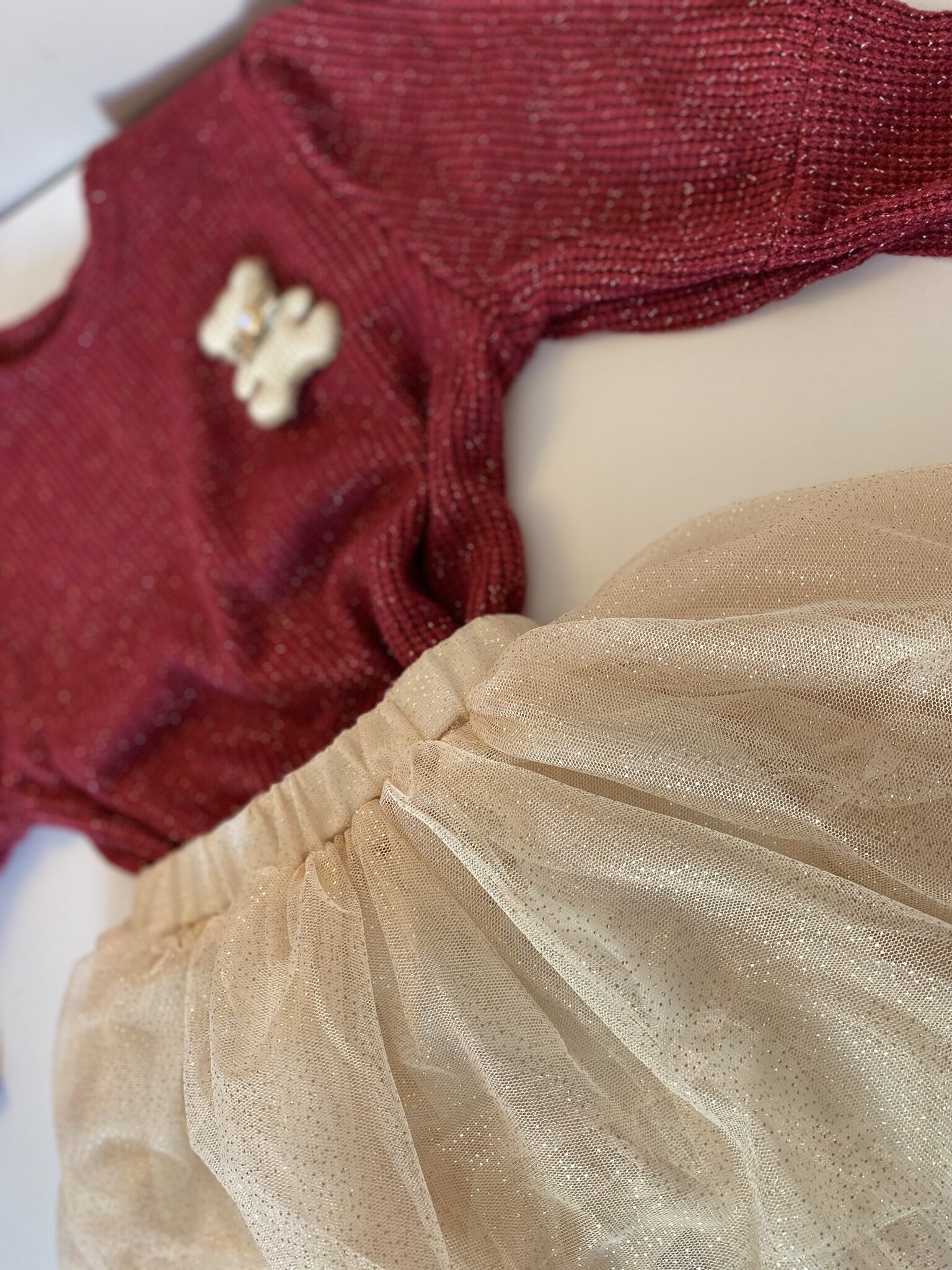 Jednym z największych atutów tej spódniczki jest subtelny brokatowy połysk, który został wpleciony w materiał w taki sposób, że nie odpada i nie podrażnia skóry. Dzięki temu ubranko wygląda niezwykle efektownie, a jednocześnie zachowuje pełen komfort użytkowania. To idealny wybór na rodzinne uroczystości, przyjęcia, święta, sesje zdjęciowe czy występy przedszkolne.