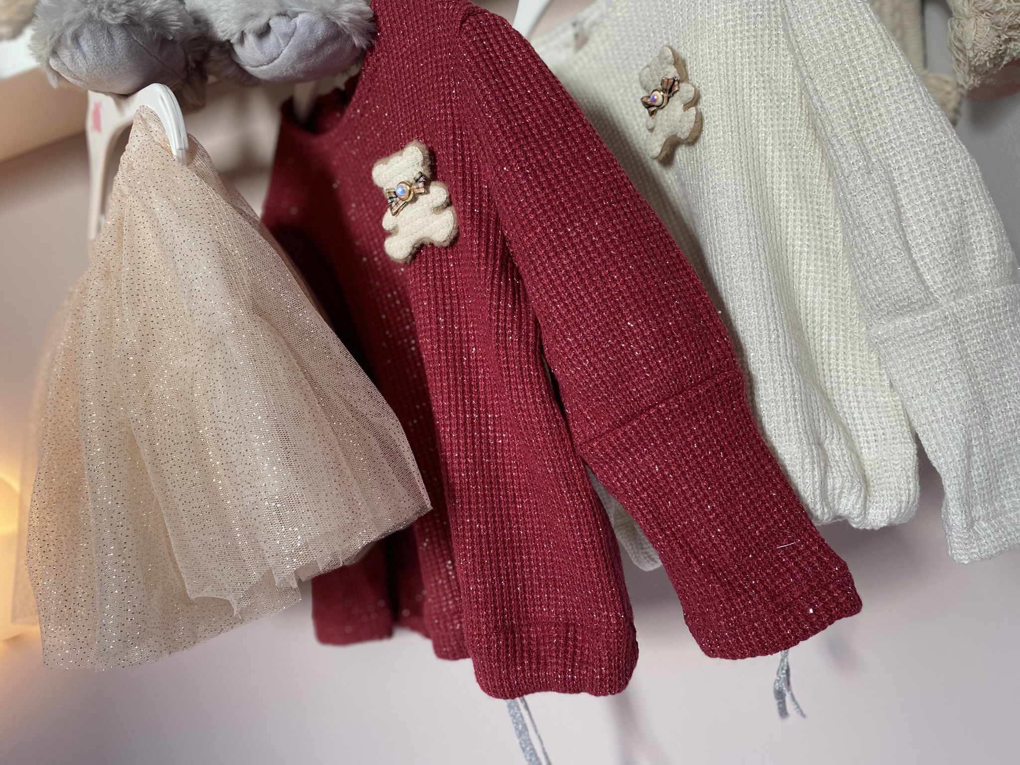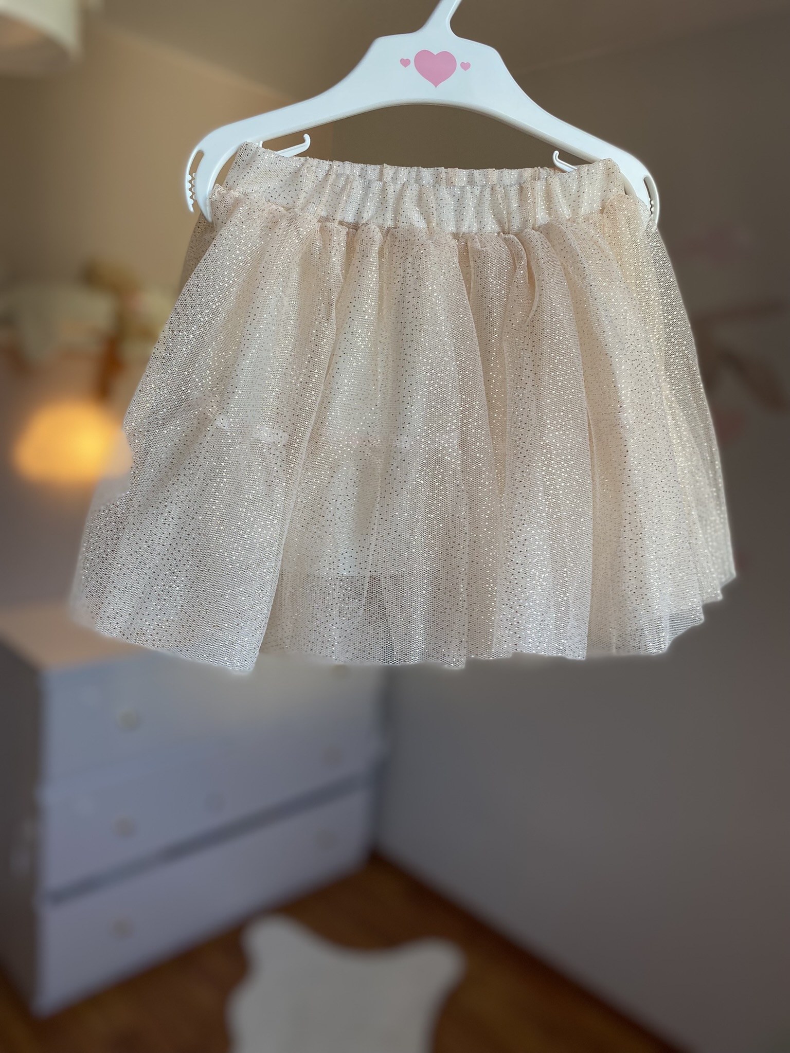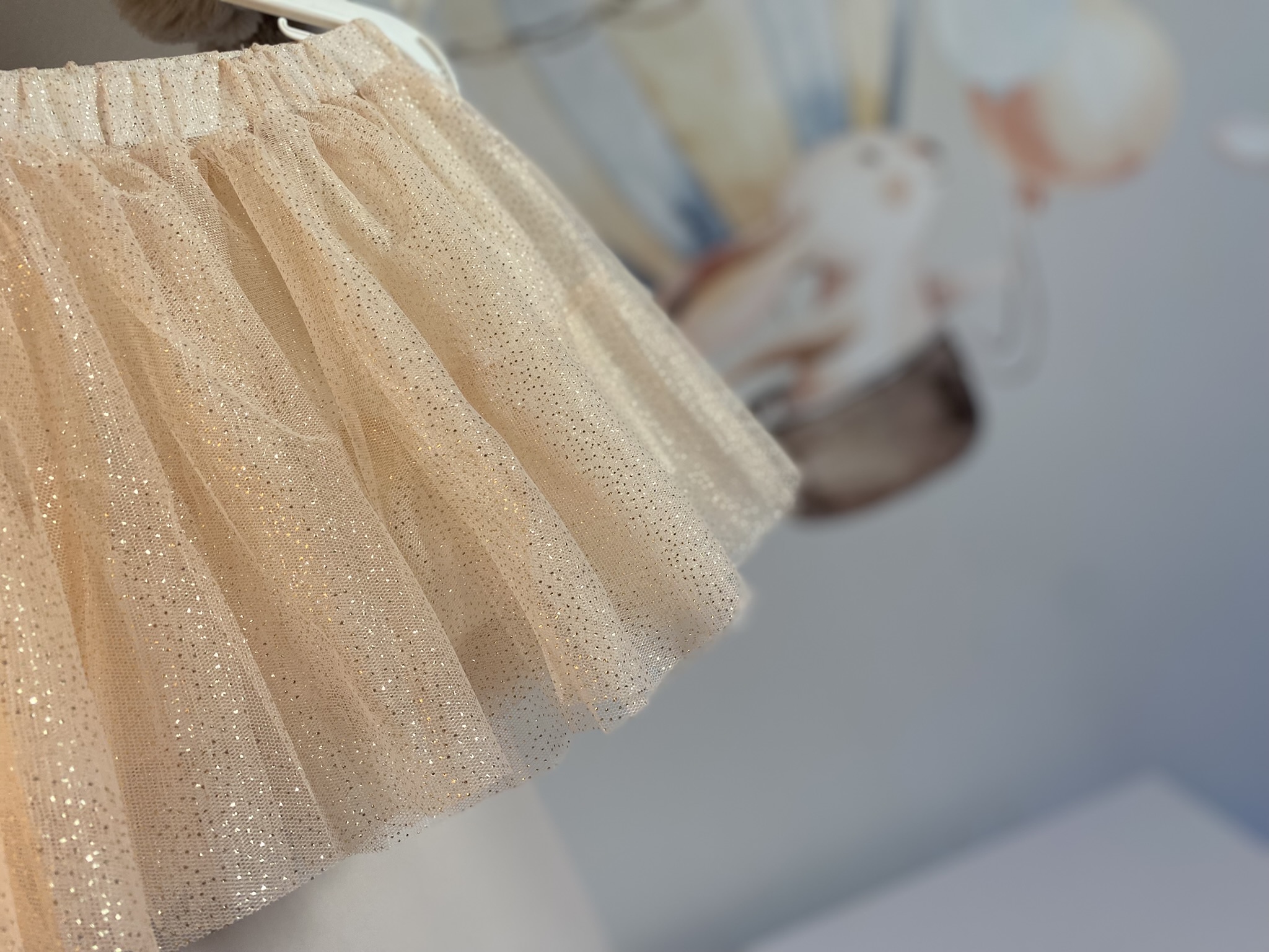Spódniczka brokatowa została wykonana z miękkiego, przyjemnego w dotyku materiału, który nie krępuje ruchów dziecka. Dzięki temu maluch może swobodnie tańczyć, biegać i bawić się przez cały dzień, czując się przy tym komfortowo. Delikatny beżowy kolor dodaje całości elegancji i sprawia, że spódniczka doskonale komponuje się z wieloma elementami garderoby. Świetnie wygląda zarówno z prostym T-shirtem, jak i z elegancką bluzką czy jednym z naszych sweterków dostępnych w ofercie Kic Kic Kids — tworząc wyjątkowe i urocze stylizacje.
