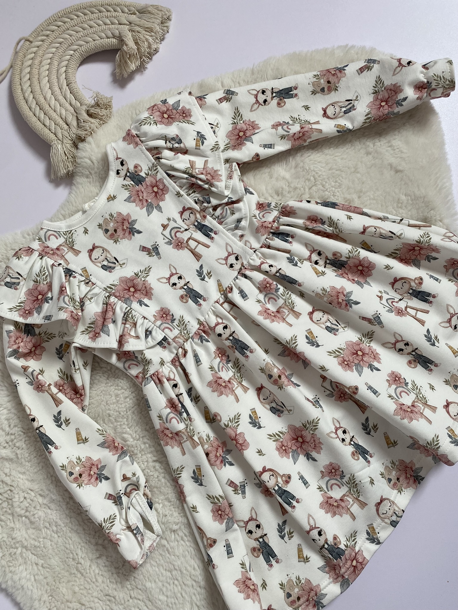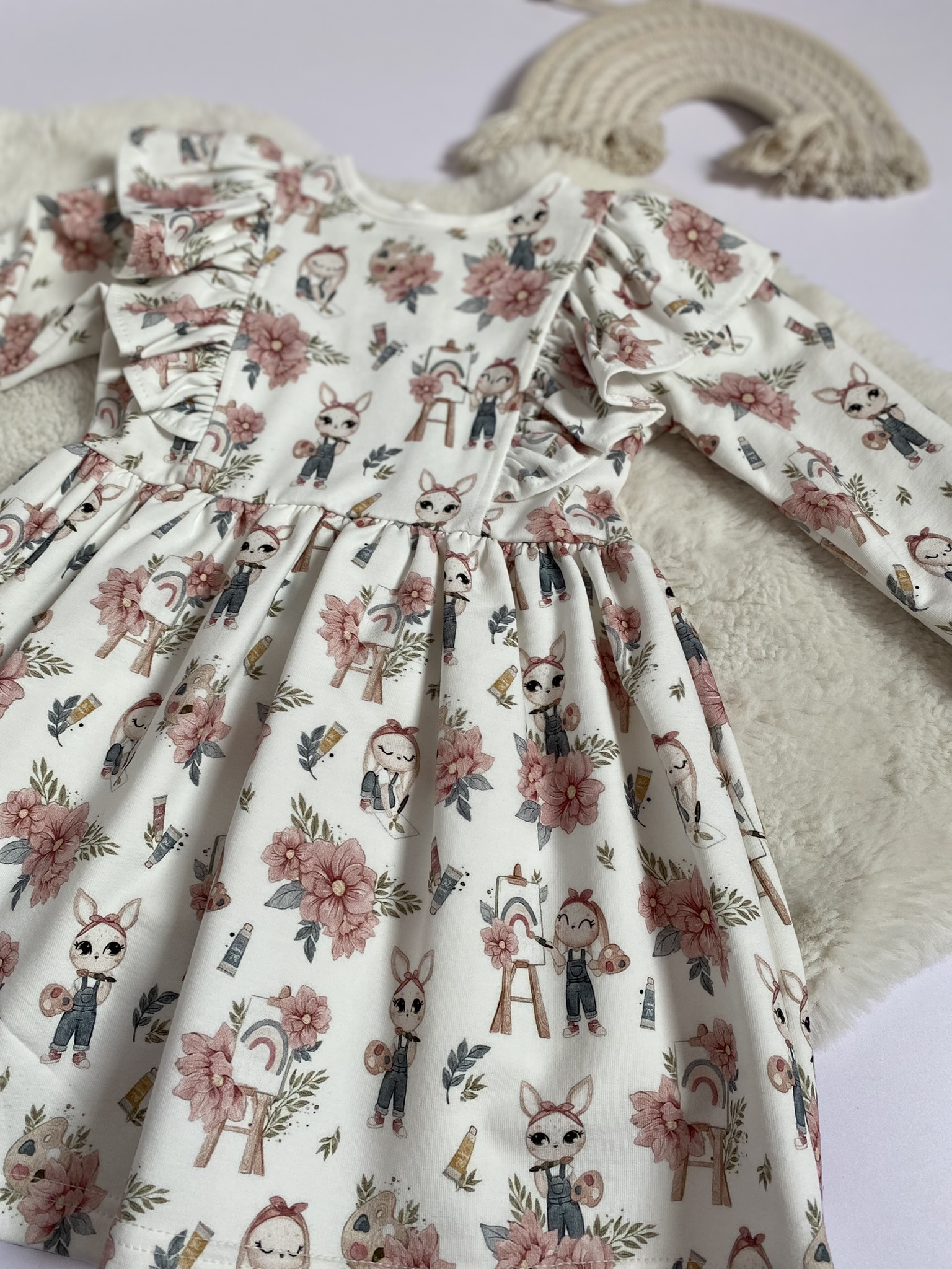 Sukienka dziewczęca – króliczki malarze to uroczy model stworzony z myślą o małych miłośniczkach bajkowych wzorów i komfortowej garderoby. Sukienka wyróżnia się bajkowym motywem – na białym tle pojawiają się sympatyczne króliczki malarze oraz delikatne kwiaty, które nadają całości lekkości i dziewczęcego uroku. To ubranko, które świetnie sprawdzi się zarówno na co dzień, jak i na specjalne okazje.