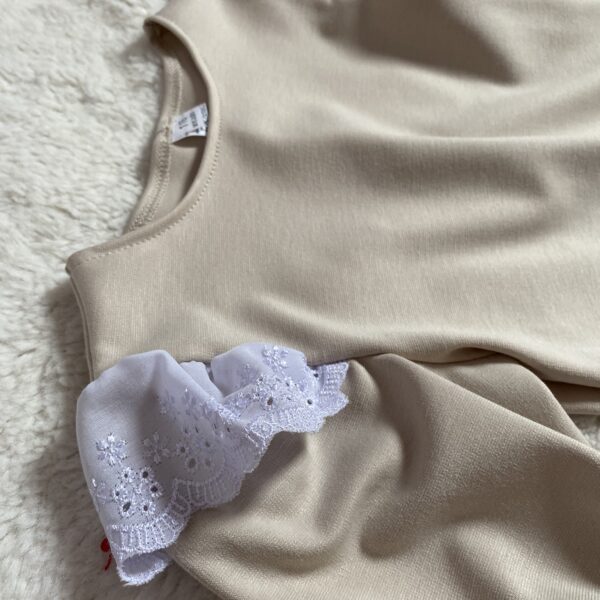 Pod tiulem znajduje się bawełniana podszewka w tym samym kolorze, która zwiększa wygodę i zapobiega prześwitywaniu materiału. Całość wykonana została z 95% wysokogatunkowej bawełny i 5% elastanu, co sprawia, że materiał jest miękki, przyjemny w dotyku, elastyczny i dobrze znosi pranie.